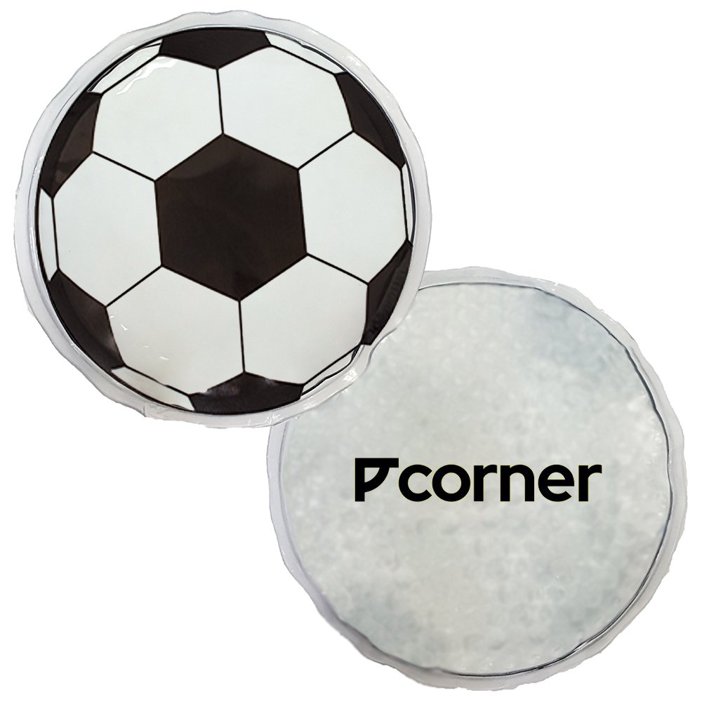Compresa en PE rellena en gel térmico apto para frio y calor. Estampado de balón de fútbol. De 10 x 10 cms.
