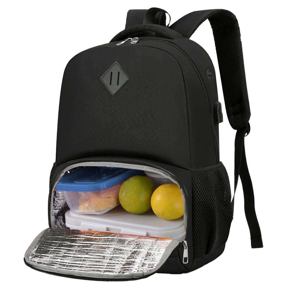 Maleta elaborada en Oxford con bolsillo principal acolchado para laptop, bolsillo auxiliar con lonchera de aluminio térmico, bolsillo lateral en malla elástica para bebidas. Salida lateral para cables USB. De 46 x 32 x 15 cm. Capacidad hasta 18 kilos.
