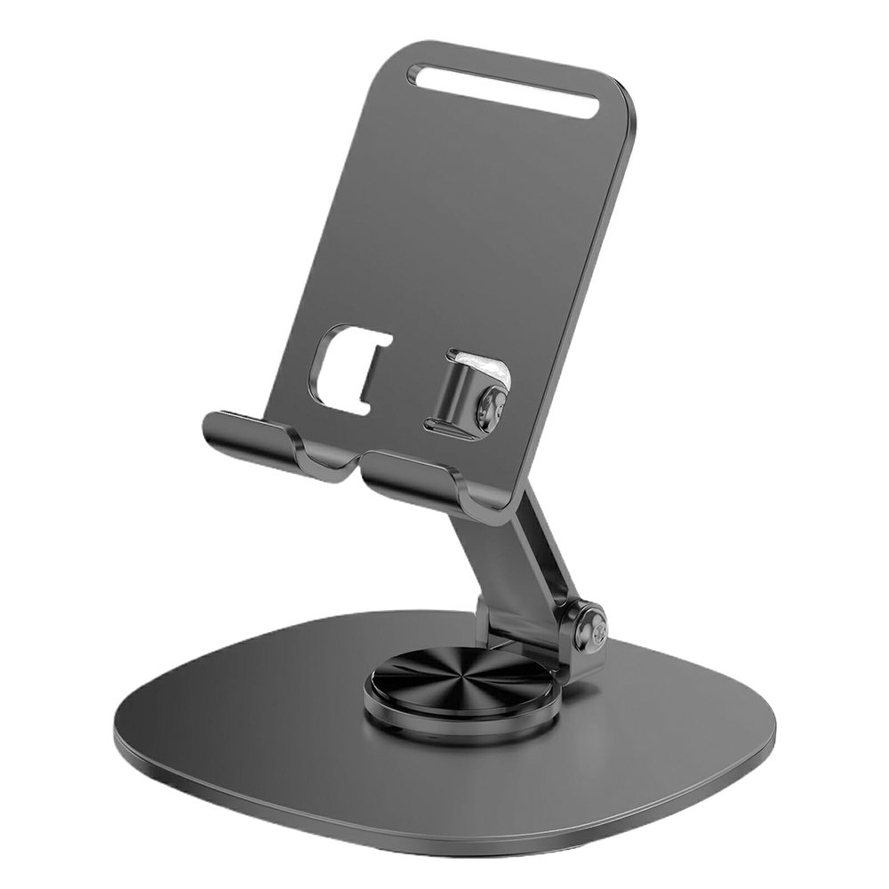 Soporte para celulares con base giratoria de 360º en aluminio. Brazo metálico y plegable, fácil de transportar.